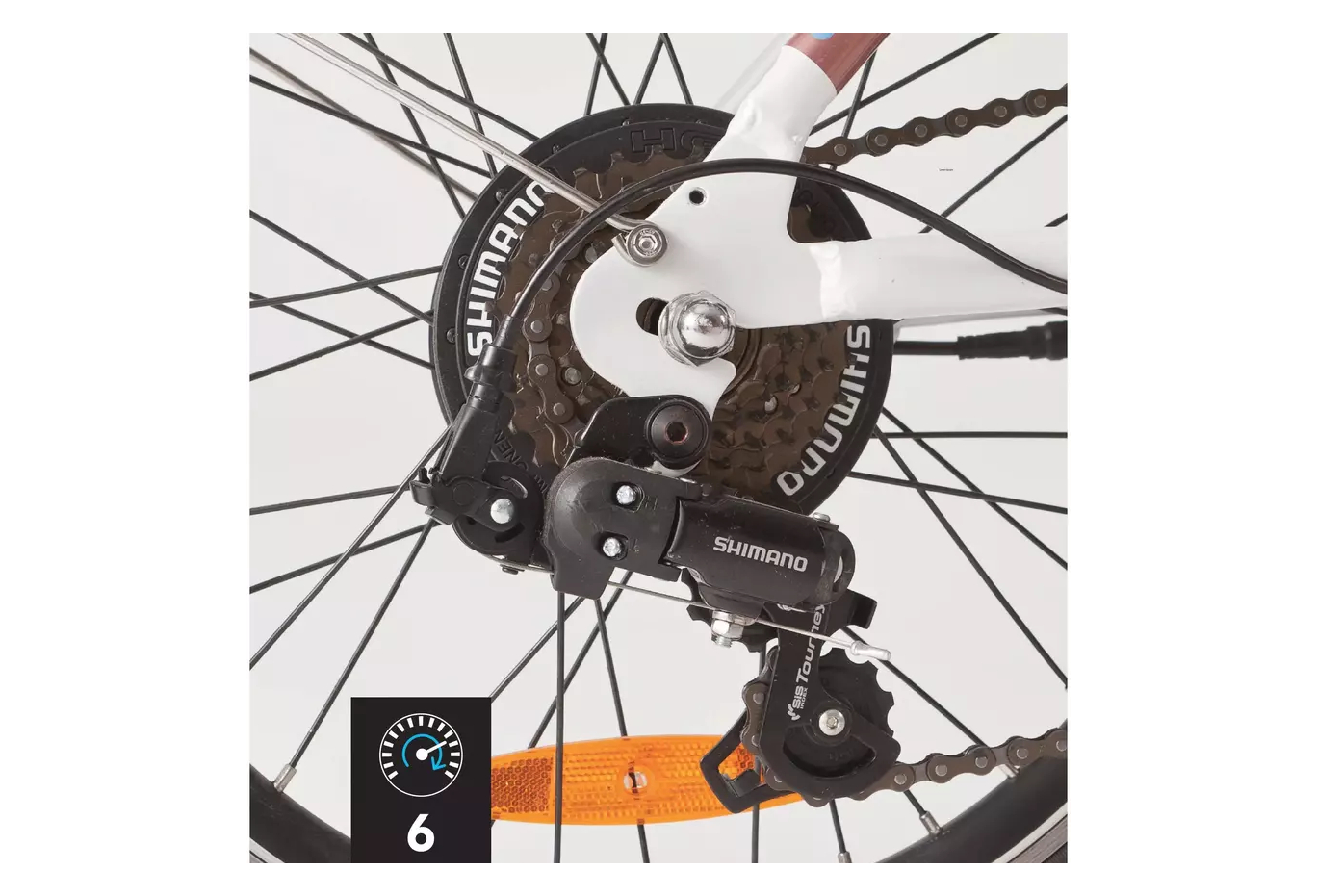6 vitesses par poignée tournante shimano. Dérailleur arrière 6 vitesses shimano tourney.