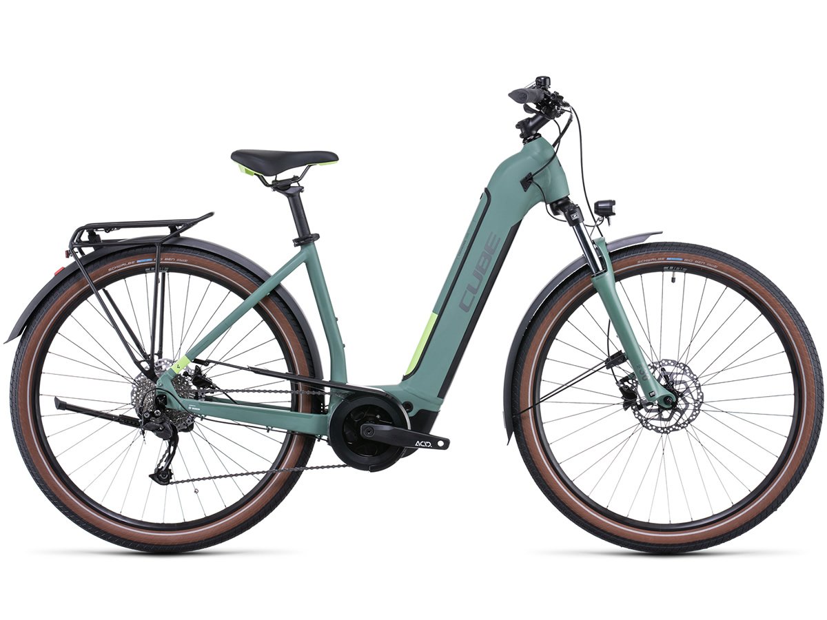 Le vélo électrique de type VTC CUBE Touring Hybrid ONE 625 green´n´sharpgreen Easy Entry 2022 vous accompagnera avec confort et style dans tous vos déplacements urbains.
