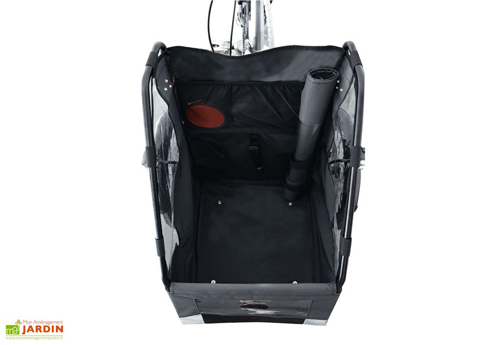 Facile à installer, ce module de transport pour chien affiche des dimensions de 45 x 55 x 70 cm et se place à l’avant de votre triporteur. Il est doté d’une solide armature métallique revêtue de textile traité anti-UV et imperméable, conçu pour résister aux pluies de moyenne intensité. Sa couverture pourra être aisément rabattue afin de protéger votre chien des intempéries ou de la poussière.