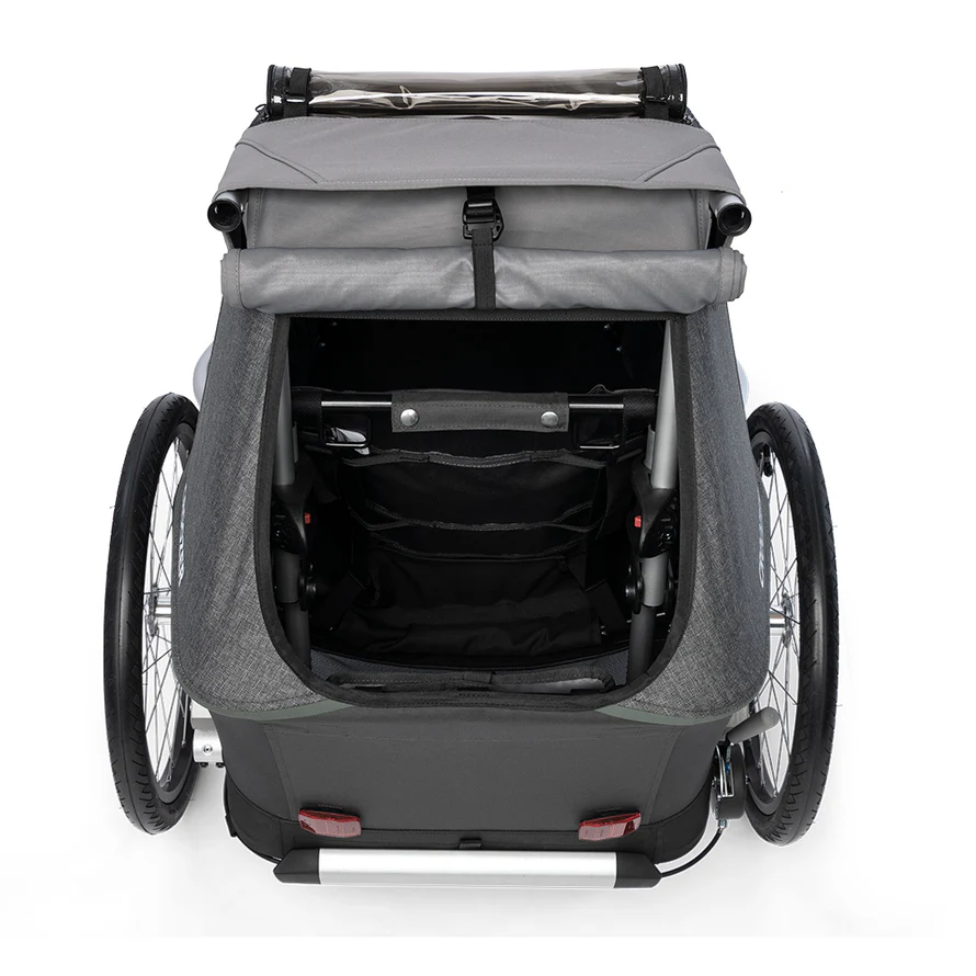 L’habitacle de la remorque Croozer est grand et protégé. D’abord par une moustiquaire, empêchant toutes les petites bestioles de passer mais permettant aussi de laisser passer l’air. Sur le côté, on retrouve plutôt des vitres en plastique pour garantir une bonne vision du paysage tout en préservant du soleil. Ensuite, par une bâche avant de protection contre la pluie (indice UPF 80+). Enfin, par un marquage du logo réfléchissant sur le tissu gris « Mountain Grey » et un drapeau de sécurité afin d’améliorer la visibilité au loin.